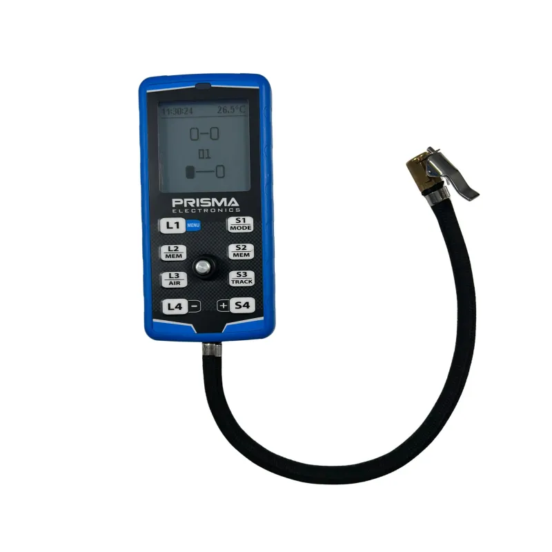 Manómetro para neumáticos con cronómetro y sensor de temperatura por infrarrojos de la marca PRISMA ELECTRONICS.