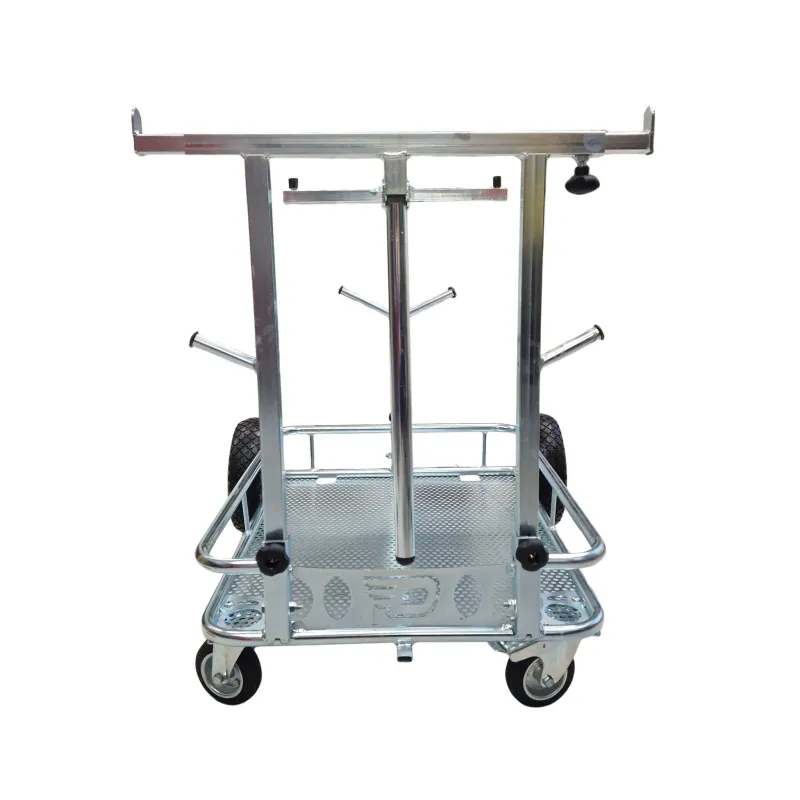 Carrello portakart DRAKE in acciaio cromato dotato di quattro ruote in gomma di cui due girevoli e di fermi scorrevoli che consentono la regolazione per ogni telaio.