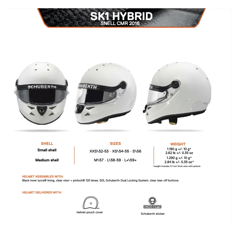 Casco modello SK1 HYBRID del marchio esclusivo SCHUBERTH, completo di omologazione SNELL CMR 2016.
