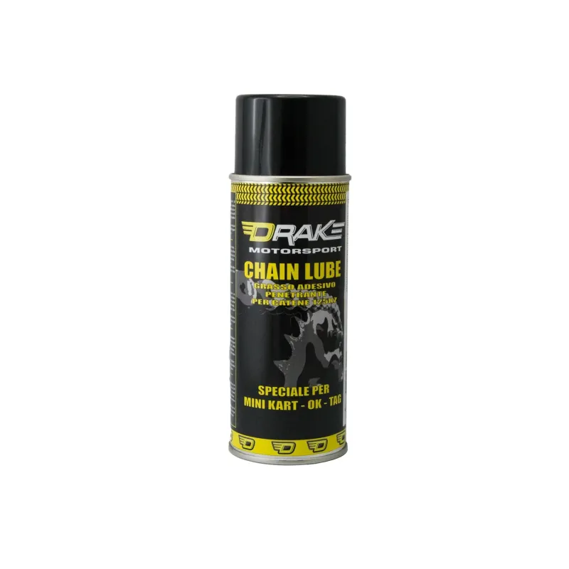 Particolarmente consigliato per kart molto veloci: DRAKE CHAIN LUBE aderisce alla catena anche alle alte velocità.