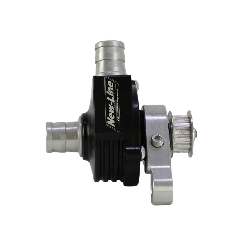 Pompa ricavata dal pieno, in alluminio, ideata e realizzata per poter garantire una portata d'acqua ideale se abbinata ai tubi e radiatori New-Line Racing.