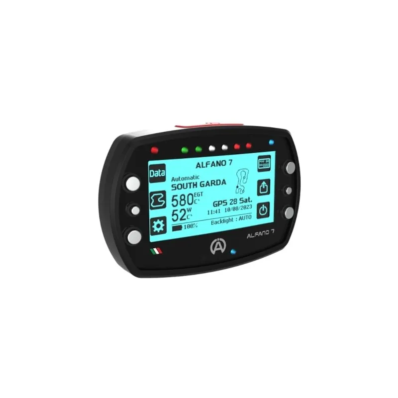 Alfano 7 2T è dotato di 4 sistemi GPS (unico nel settore): GPS sistema americano – Glonass sistema russo – Galileo sistema europeo– BeiDou sistema cinese, per rilevare i tempi sul giro e intertempi e velocità. Giri motore, 2 temperature.